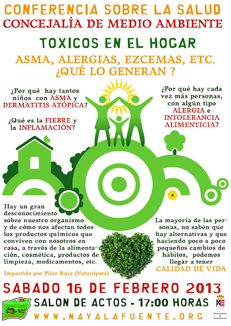 Asma, alergias, ezcemas, etc. ¿Qué los generan? ¿Por qué hay tant@s niñ@s con asma y dermatitis atópica? ¿Por qué hay cada vez más personas con algún tipo de alergia e intolerancia alimentaria? ¿Qué es la fiebre y la inflamación? Hay un gran desconocimiento sobre nuestro organismo y de cómo nos afectan todos los productos químicos que conviven con nosotr@s en casa, a través de la alimentación, cosmética, productos de limpieza, medicamentos, etc... La mayoría de las personas no saben que hay alternativas y que haciendo poco a poco pequeños cambios de hábitos, podemos llegar a tener calidad de vida. Esta conferencia sobre la salud que organiza la Concejalía de Medio Ambiente de Navalafuente, será impartido por Pilar Ruiz (naturópata), y tendrá lugar en el Salón de Actos a las 17h.